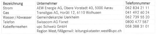 Übersicht Zuständigkeiten i.S. Werkleitungen in der Gemeinde Uerkheim (Werkleitungsbetreiber)